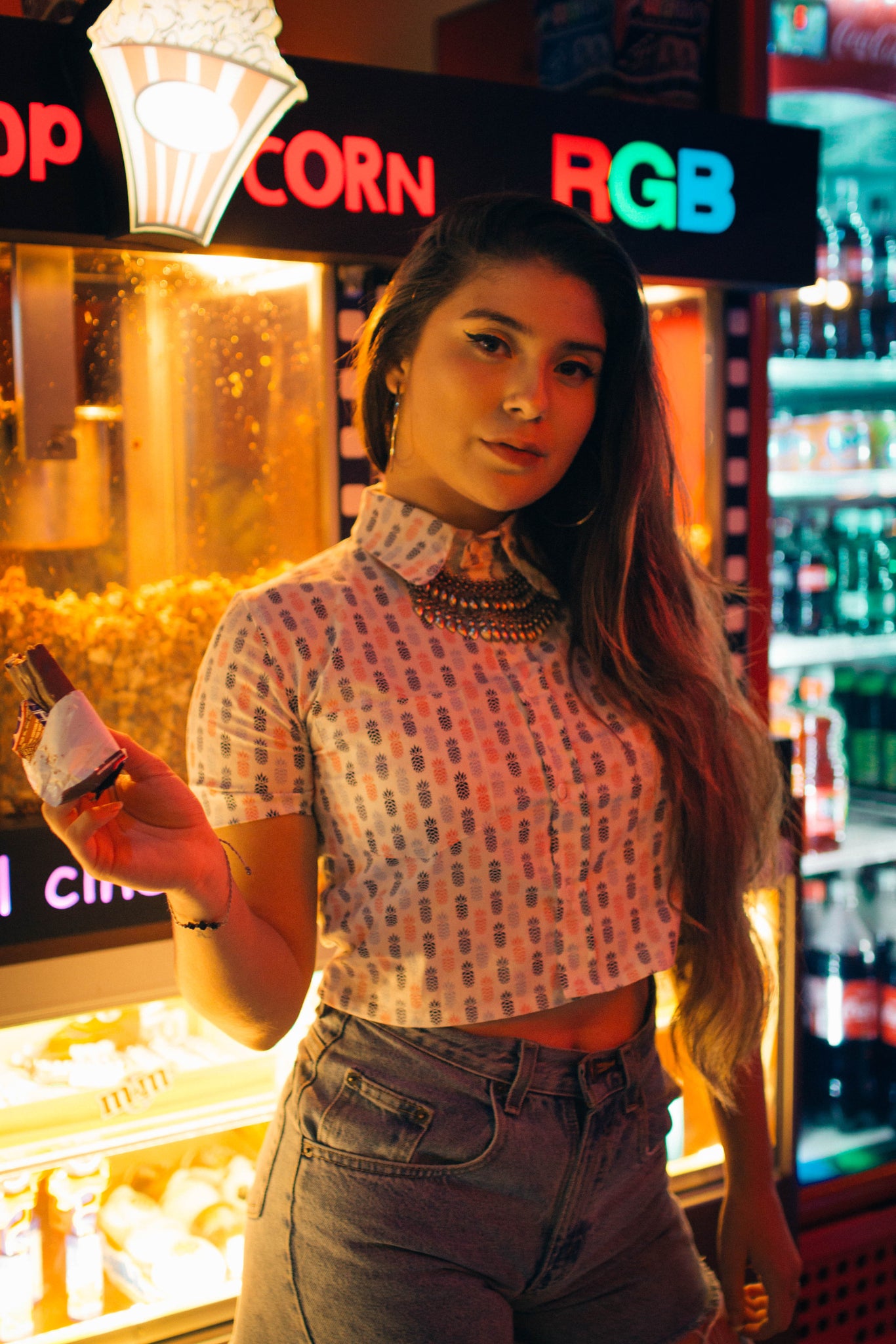 Blusa corta con cuello camisero y botones. Con estampado de piñas